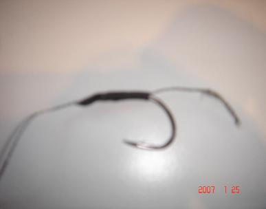 Line Agliner: Über die verbindung(No Knot) zwischen Haken und Vorfachschnur, bei mir in der Regel Silkworm von Kryston, wird ein Schrumpschlauch geschoben. Dieser wird in kochendem Wasser oder über heißem Wasserdampf geschrumft. Der Schrumpfschlauch schützt einerseits den Knoten andererseits sorgt er dafür, dass der Haken sich im Fischmaul besser dreht also dafür dass der Fisch besser gehakt wird. Dies kommt daher,da man den Schrumpfschlauch nach dem schrumpfen, wenn er noch elastisch und flexibel ist leicht in Richtung der Hakenspitze justiert. Fertig gebundener Line Agliner: