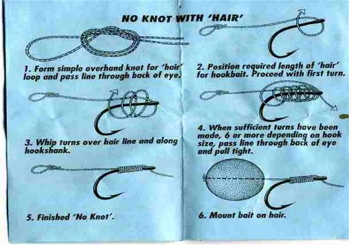 Rigs, ein Thema über das viel geschrieben und debattiert wird, was man jedoch meiner Meinung nach nicht überbewerten sollte. Ich fische nur zwei verschiedente Arten von Rigs. Einen einfachen Line Agliner welchen ich in 80% der Fälle einsetze oder ein Stiff_Rig. Bei beiden Rigs verwende ich zur Verbindung zwischen Haken und der Vorfachschnur einen knot less knot was auf deutsch knotenloser Knoten heißt. Beschreibung: siehe Abb.